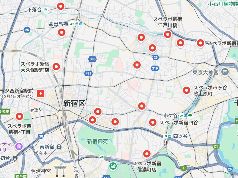 新宿区内で今、最も勢いがあるのが「スペラボ」です。 西新宿、北新宿、四谷、神楽坂、大久保など、主要なエリアをほぼ網羅しており、新宿区内だけで10店舗以上を展開しています。