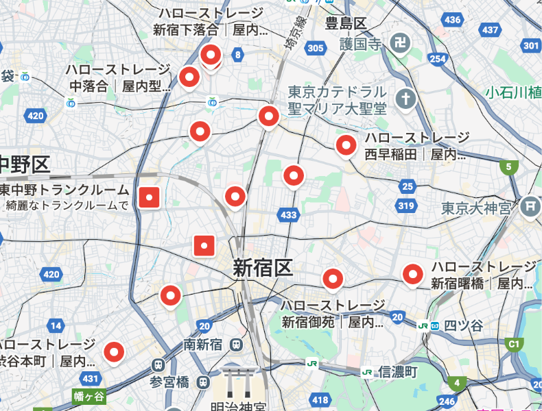 新宿区内でも、中井・落合・高田馬場などのエリアには「ハローストレージ」が多く存在します。 特にこのエリアは屋外コンテナ型も残っており、「大きな家具を安く預けたい」「バイクを駐車したい」というニーズには最適です。屋内型も増えているので、選択肢は広いです。